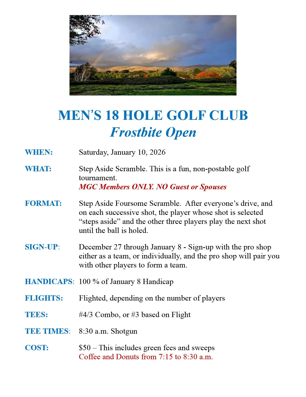| Jan 10 | Frostbite Open: 4-Man Teams, Scramble Format, Flighted For more info, click on POSTER RESULTS |