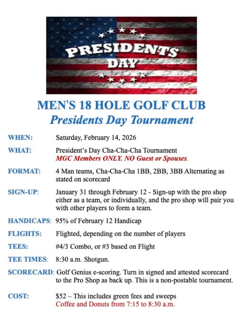 Note: The Pro Shop will post Event scores. Please total and sign your score cards legibly, or they may be disqualified. Tournament details may be modified and will be published prior to each event. Shotgun starts may change to Tee Times as determined by the Director of Golf.