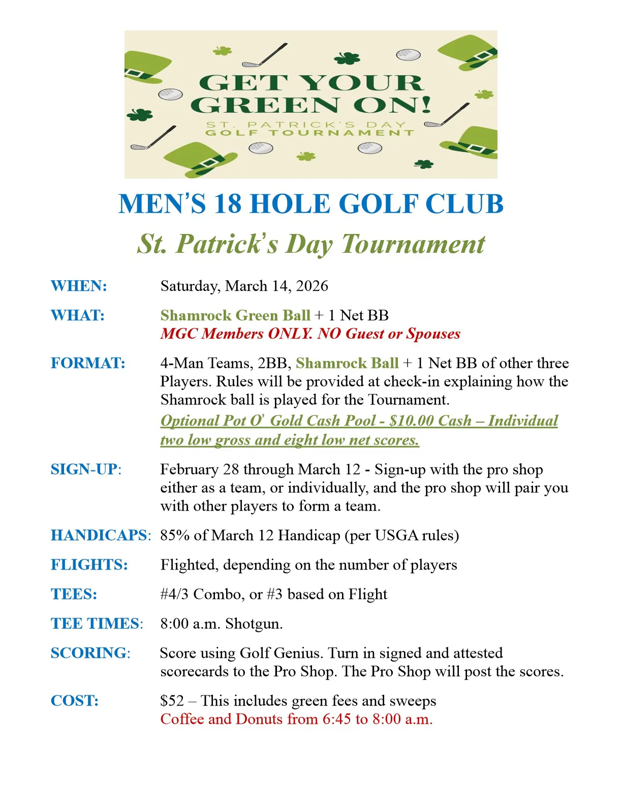 St. Patrick’s Day: 4-Man Teams, 2 BB Net (with Shamrock Ball), Optional Pot O’ Gold Cash Pool, Flighted For more info, click on POSTER RESULTS |